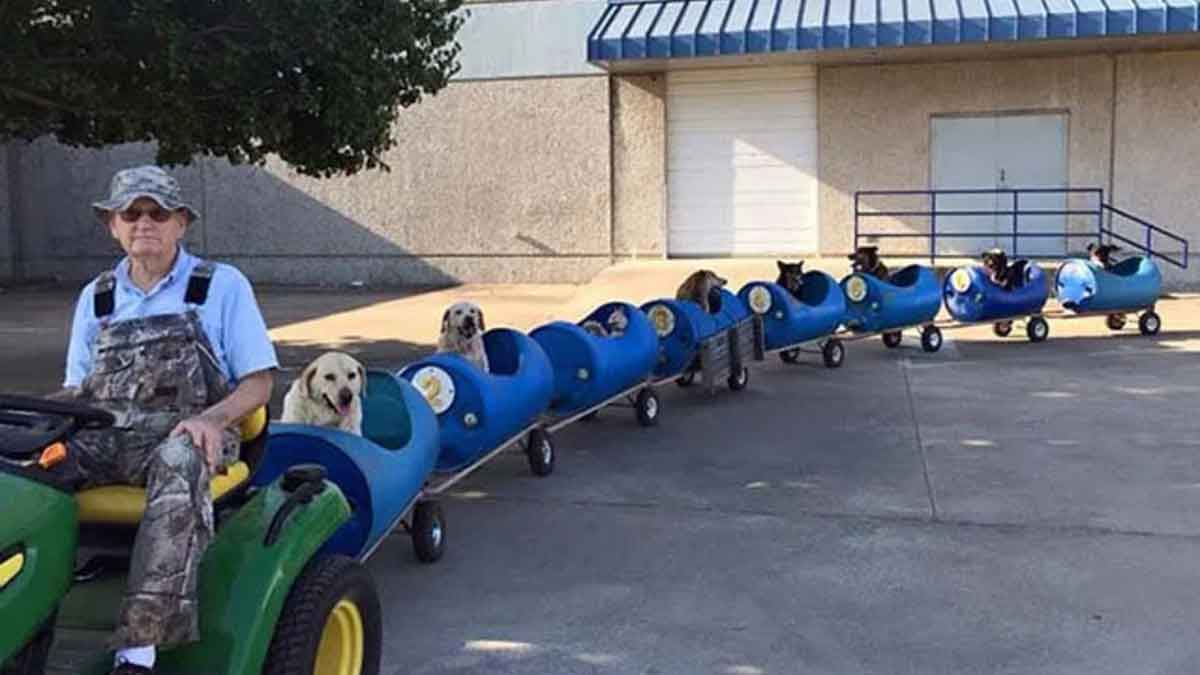 Eugene Bostick de Fort Worth, Texas a construit un train de fortune pour promener ses chiens sauvés, le train de chiens fait maison emmène plusieurs chiens errants sauvés pour des promenades amusantes dans le quartier et ils font également des randonnées dans les environs.